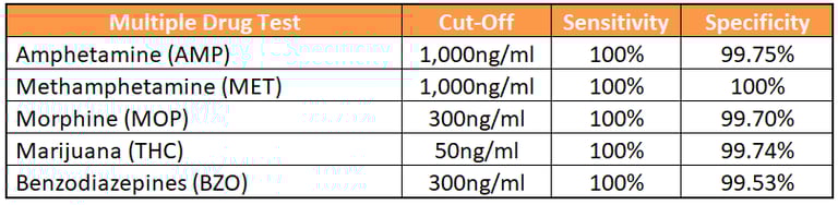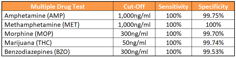 The One Step Multi-Drug Screen Test is a lateral flow chromatographic immunoassay for the qualitative detection of multiple drugs and drug metabolites in urine at the following cut-off concentrations: