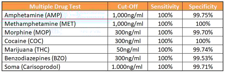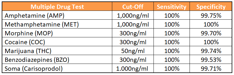 The One Step Multi-Drug Screen Test is a lateral flow chromatographic immunoassay for the qualitative detection of multiple drugs and drug metabolites in urine at the following cut-off concentrations: